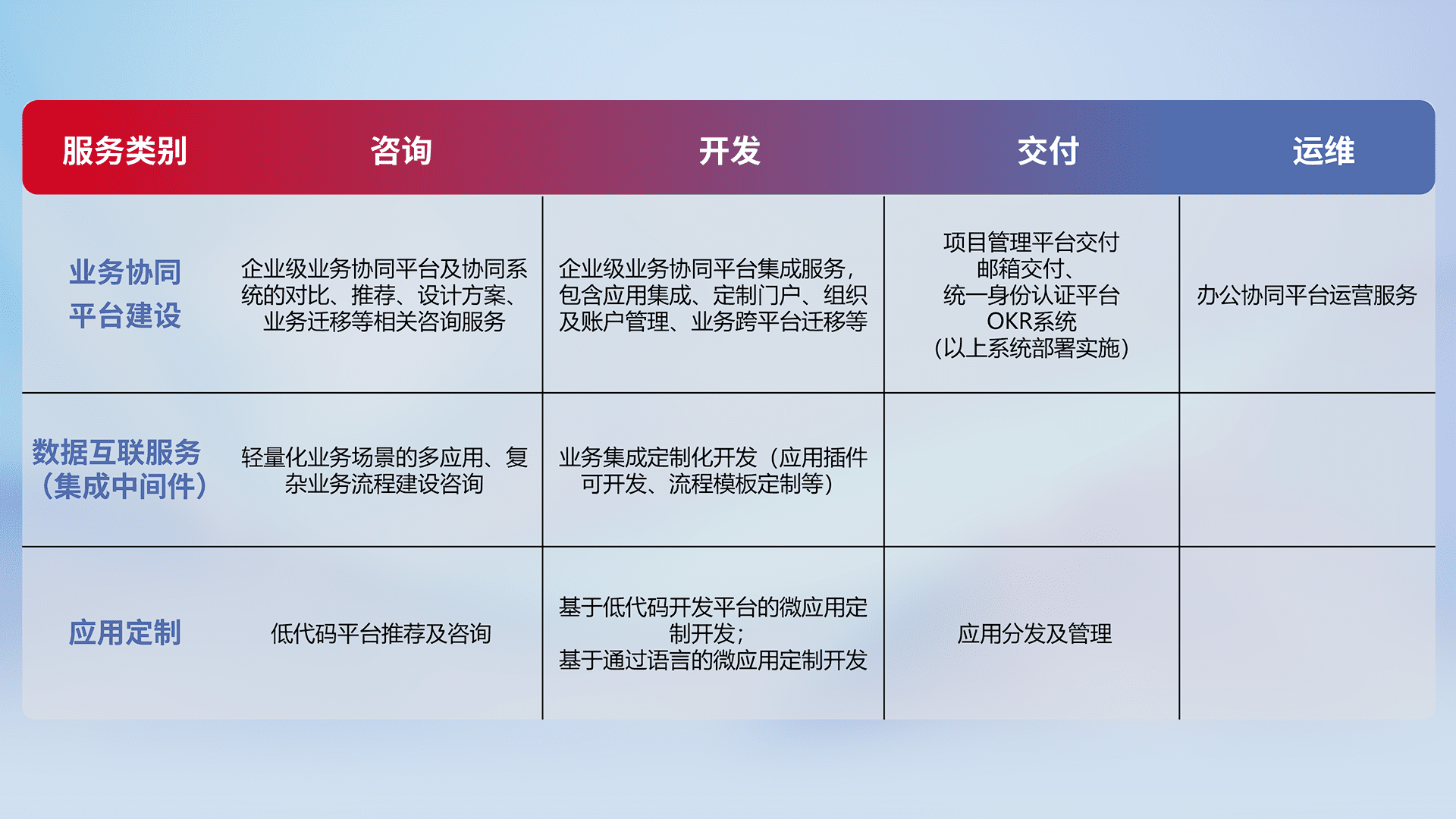 针对钉钉、、企微、、、、IDaas等平台级产品提供产品的规划、、方案、、、、交付、、定制化开发等服务,,,实现如统一协同办公、、、、智能客户服务、、、混合会议管理、、智能数据查询、、等业务场景,,实现数字化转型。。。。